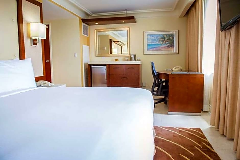 King bedded, averages 236 sq ft, no view, located on floors 1-6, entry level room type, Tropical mural, Small desk and chair, 50” TV, Safe, Phone, Mini Refrigerator, Individual Coffee Maker, Combined Tub and Shower